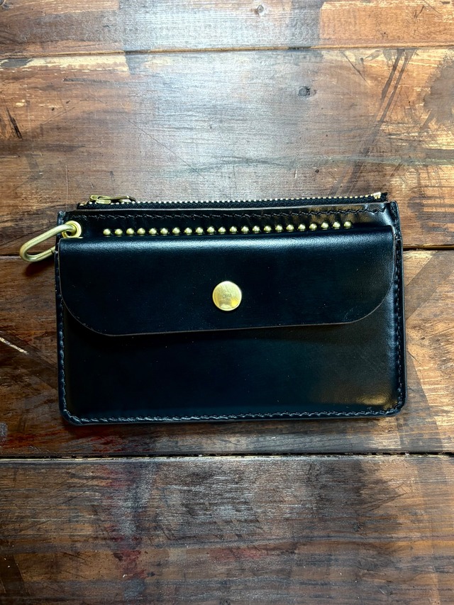 モデル:PT-01 気軽に持ち歩けるウォレットを考え制作させていただきました。 中に仕切りが1枚ありますので、お札とコインを分けてご利用いただけたりします。 ご利用に応じて仕切りを使っていただければとおもっています。 小判カンにはウォレットチェーンを付けていただけますし、カラビナでぶら下げたりもできます。 ネックロープを使って首からぶら下げたりも◎ 人気のフラワースタッズを施し、アメカジ色を強めに出してみました。 ■サイズ 横:14cm 縦:9cm 二つ折りのお札がスッポリ入るサイズとなっています。 カードは10枚程度は入れていただけます。 ■レザー 国産ヌメ革 ブラック 手染め 茶芯 ■金具 真鍮