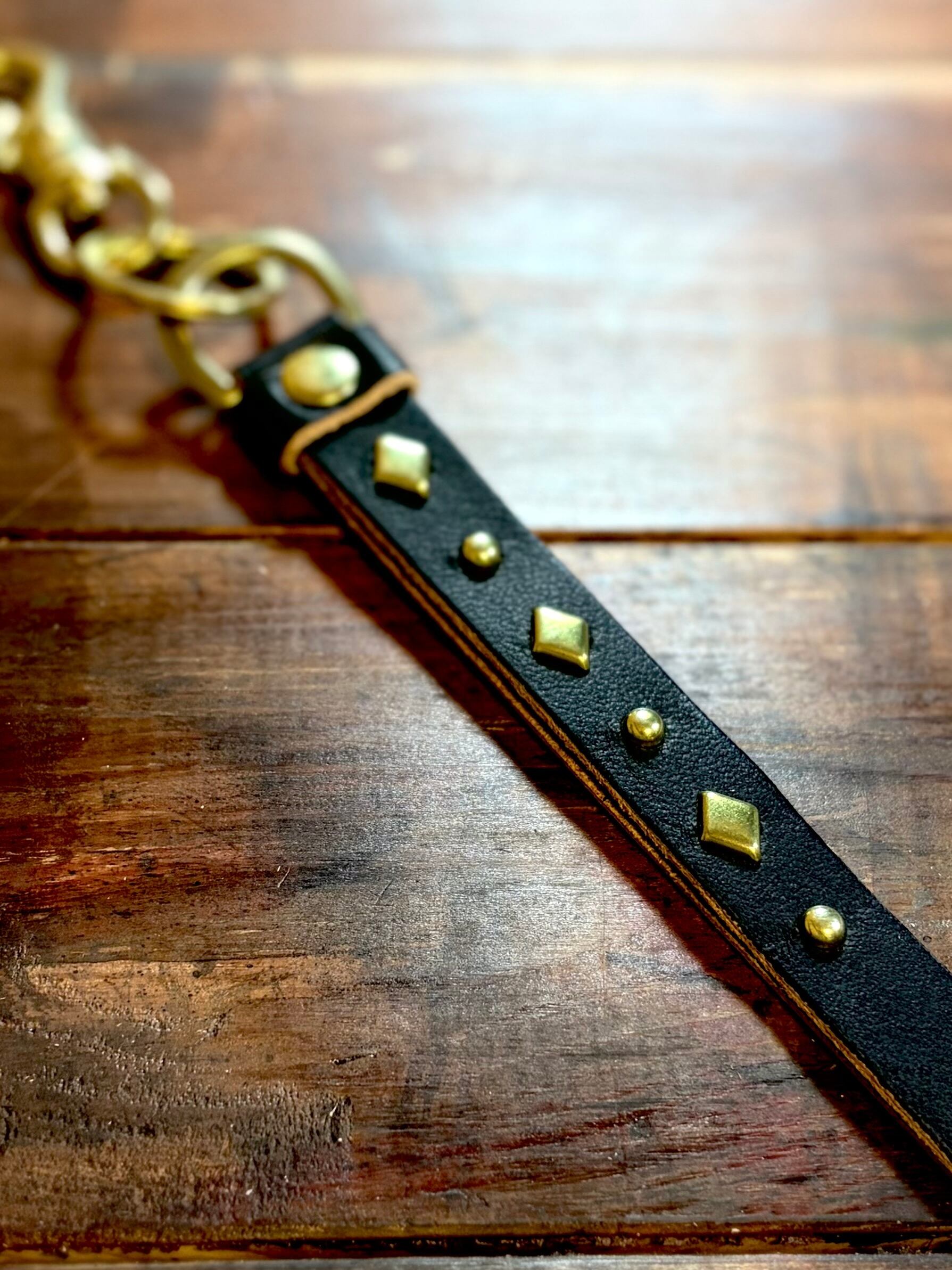 国産ヌメ革を丘染めにて染色したレザーを使い、アメリカのスタンダードリベッド社のスタッズを配置しました。