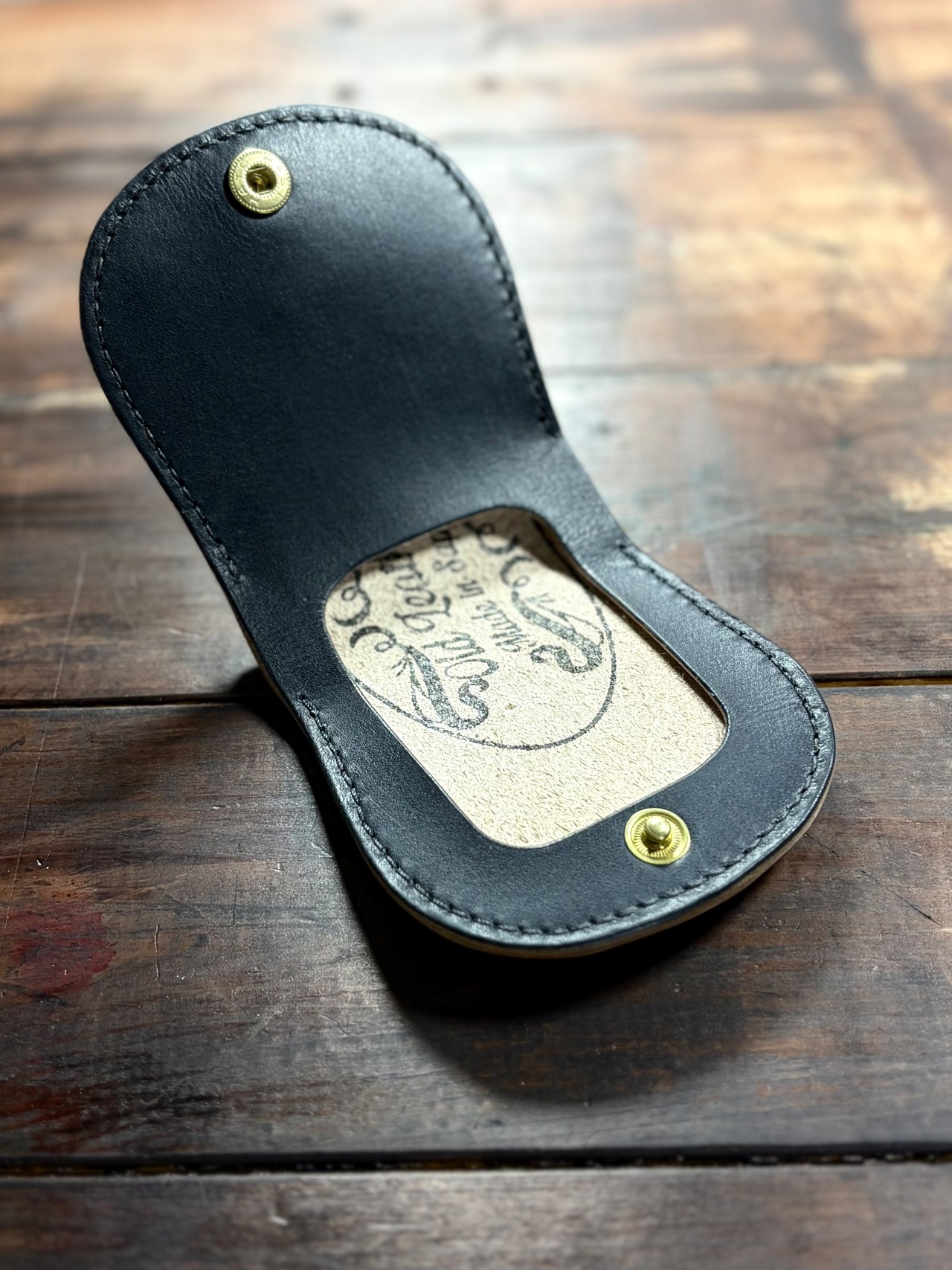 国産ヌメ革の丘染め茶芯仕様のレザーにて制作。